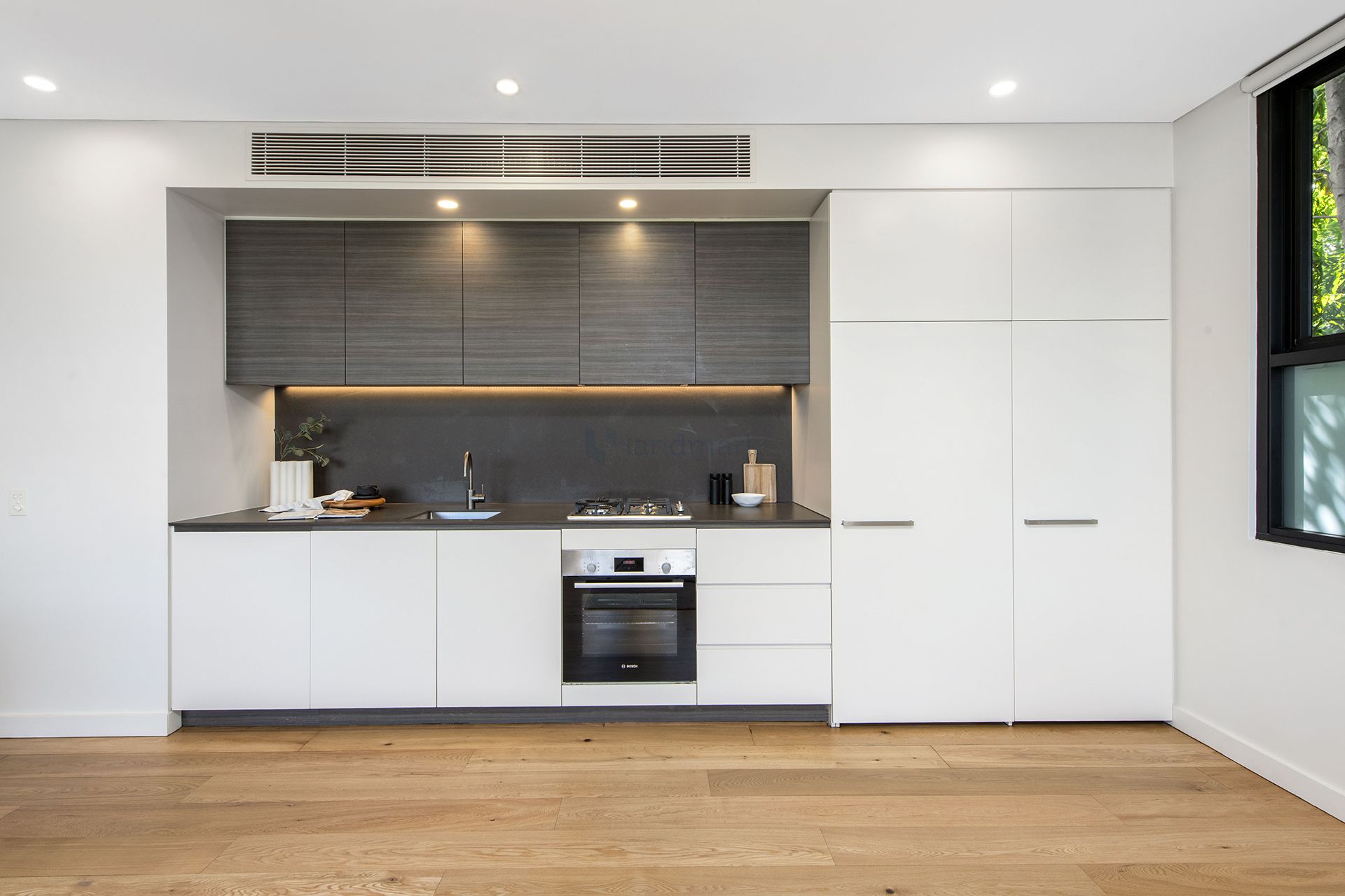 * Sleek gourmet kitchen with brand new Bosch oven, gas cooktop and integrated fridge