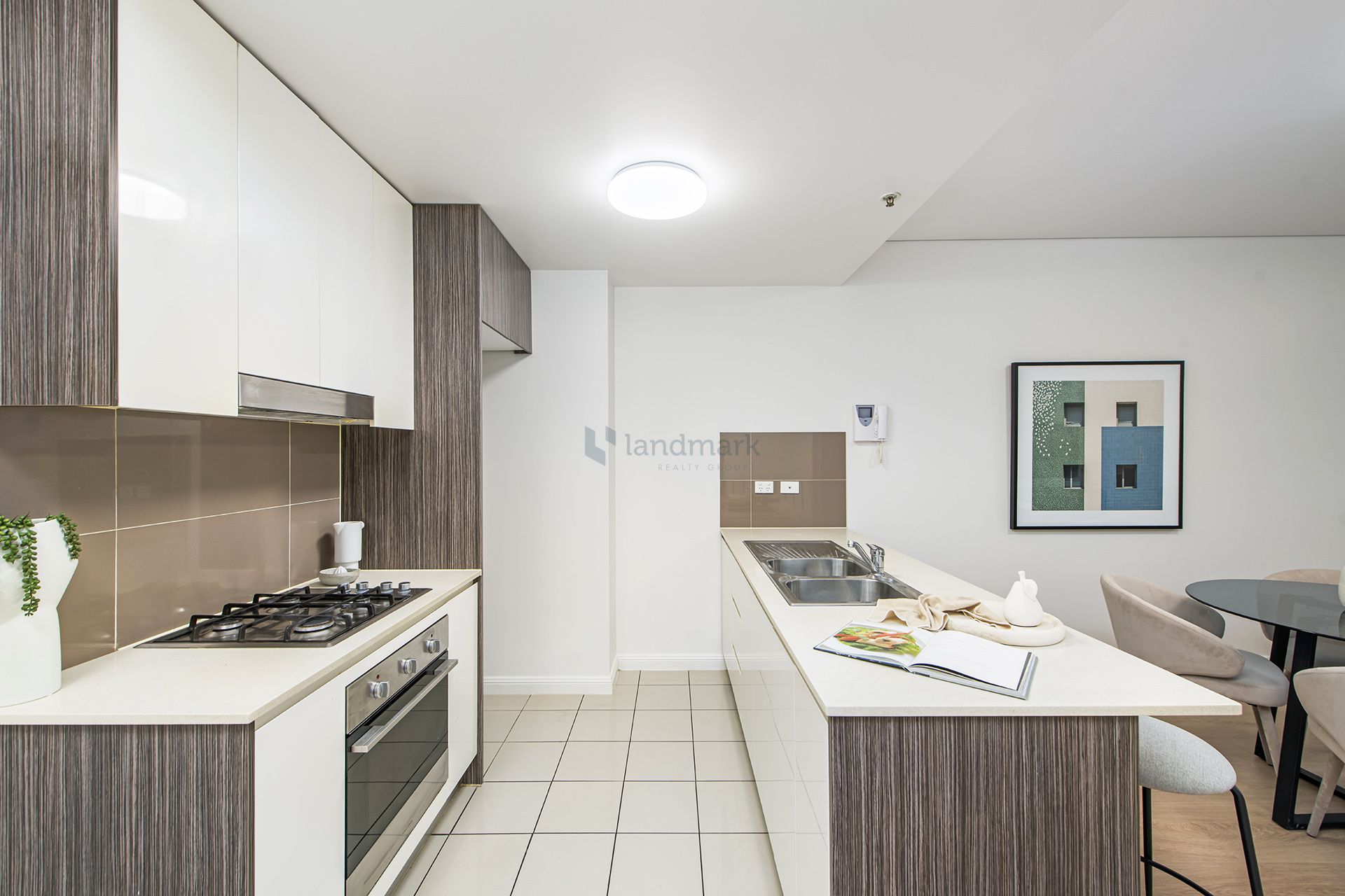 * Contemporary kitchen; stone benchtop, gas cooking, S/S appliances
